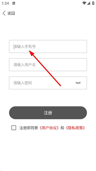 4、進入注冊頁面后,需依次輸入手機號、用戶名、密碼,勾選同意相關協議后,點擊注冊按鈕完成賬號注冊。