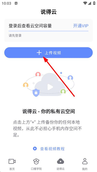 3、說得云登錄提示與VIP開通入口清晰,上傳視頻按鈕便捷,私有云空間支持本地視頻備份,解決內存困擾,配套教程指引操作,保障作品存儲安全。
