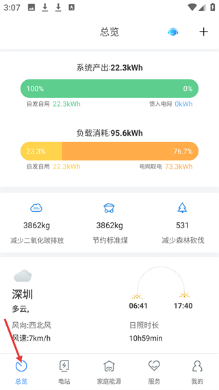 1、總覽頁,展示系統產出、負載消耗、環保數據及深圳天氣日照,助力用戶掌握能源整體情況。