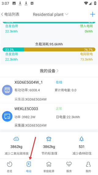 2、電站頁呈現電站列表與設備詳情,如WEKLE5C003功率3982.3W日電量22.3kWh,便于用戶管理光伏設備。