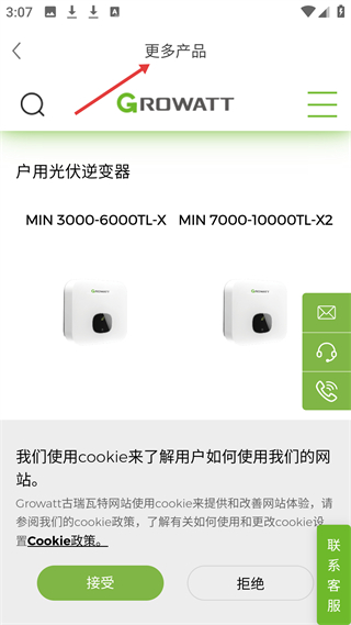 3、 GROWATT產品頁,展示戶用光伏逆變器系列,屬更多產品板塊,讓用戶了解其光伏逆變器產品。