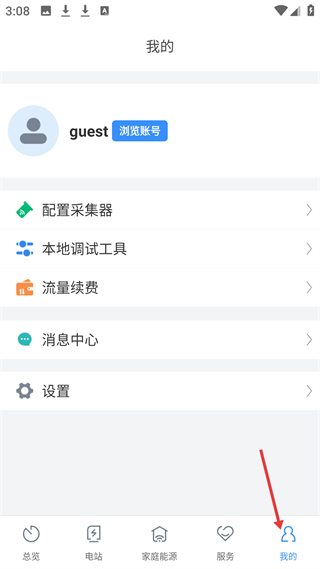 4、我的頁面,顯示guest瀏覽賬號,含配置采集器、流量續費等功能,方便用戶進行賬號及相關操作。
