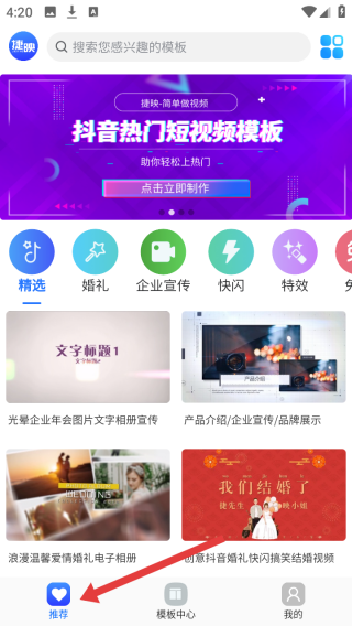 2、推薦板塊聚焦抖音熱門短視頻模板,搭配精選、婚禮等功能入口,下方陳列企業宣傳、婚禮電子相冊等模板,通過精準分類與場景化推薦。