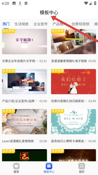 3、模板中心頁面,按熱門、生活相冊等分類陳列資源,企業宣傳、產品推廣等場景模板豐富,會員免費標簽清晰。
