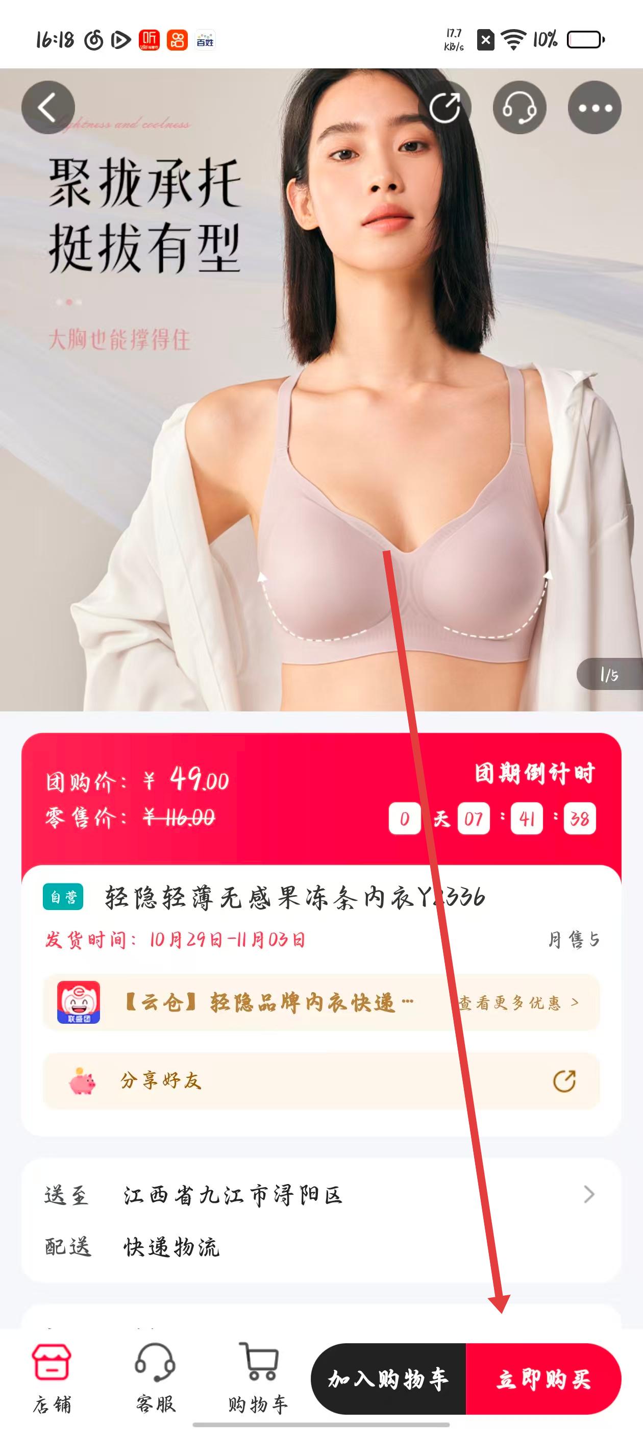4、進入內衣詳情頁查看商品圖片、團購價、零售價及發貨時間,可選擇加入購物車或點擊立即購買完成下單。