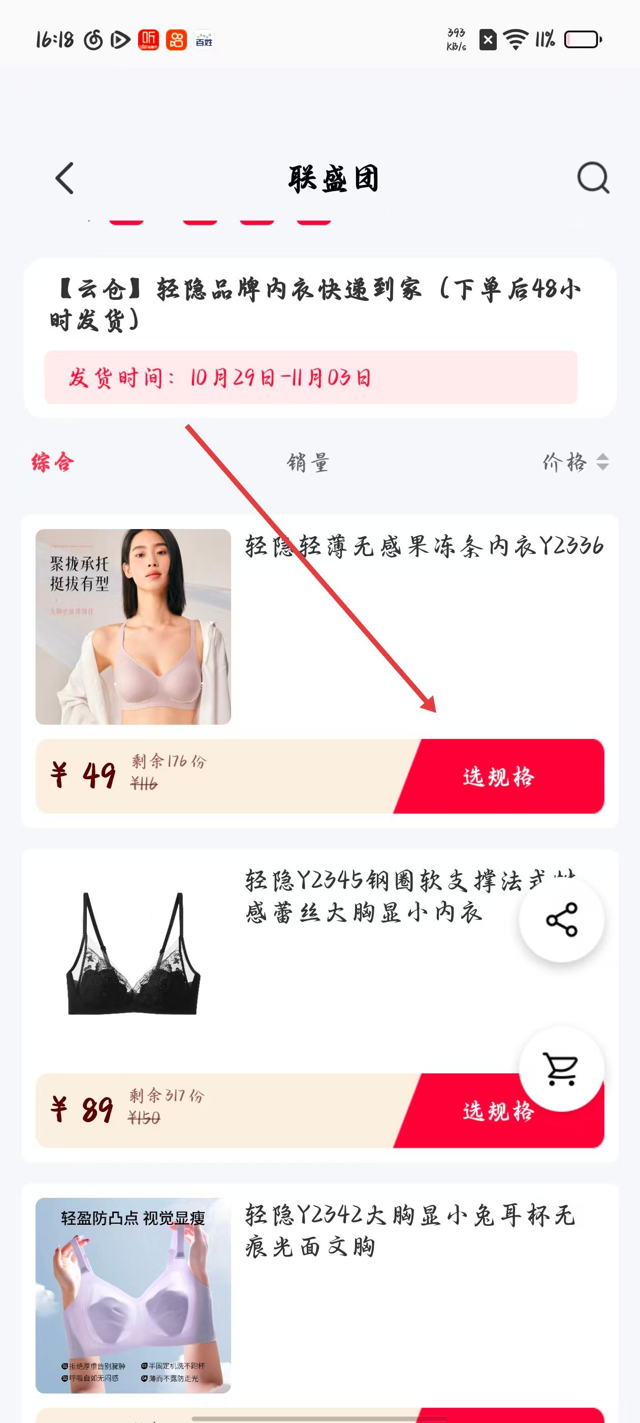3、點擊輕隱品牌內衣商品進入聯盛團商品列表頁,可按綜合、銷量、價格排序,選擇心儀的內衣款式后點擊選規格。
