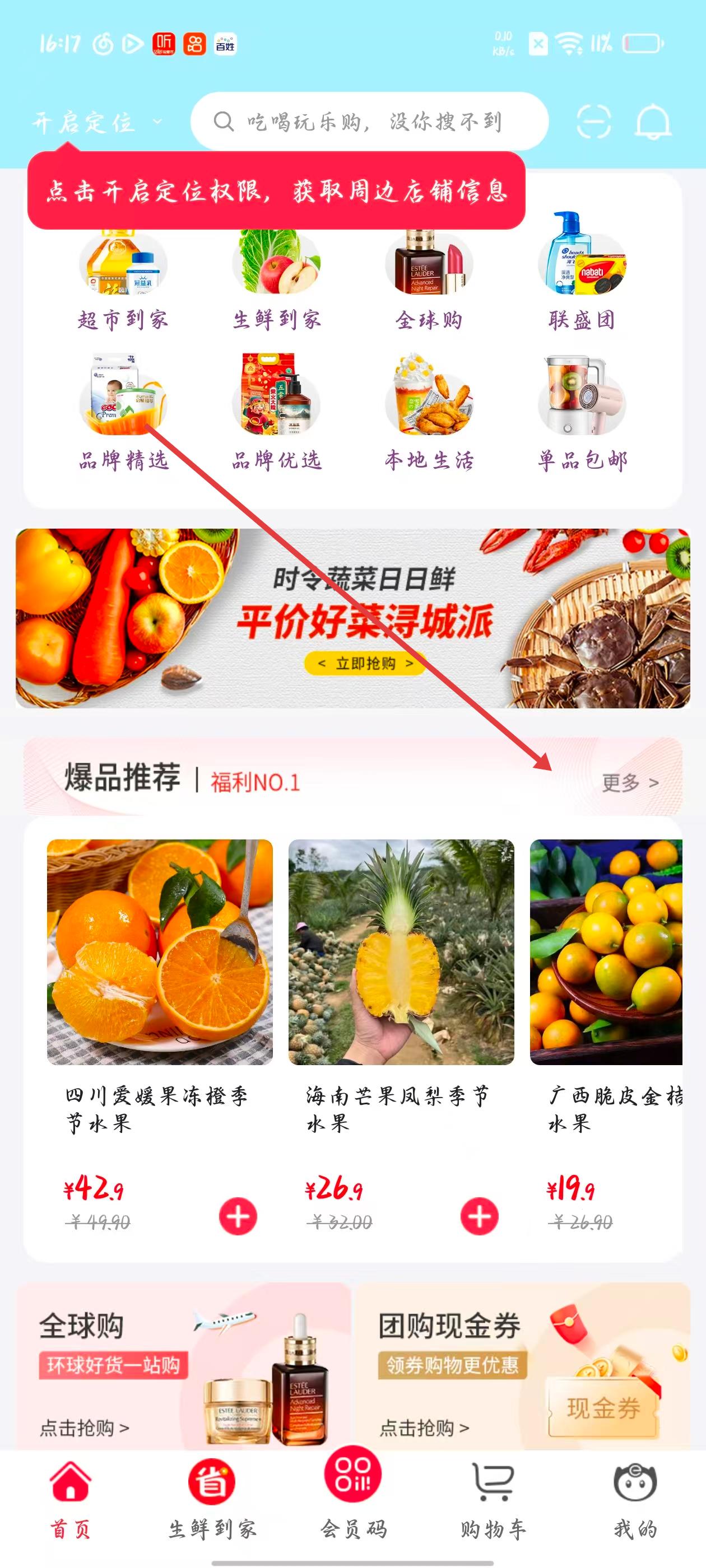 1、進入APP首頁可開啟定位權限獲取周邊店鋪信息,瀏覽超市到家、生鮮到家等板塊,在爆品推薦區點擊更多查看各類商品。
