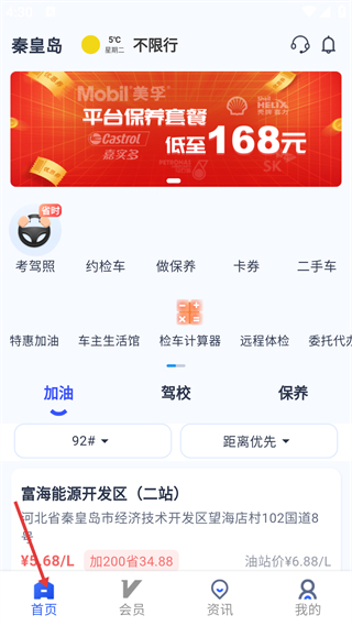 1、首頁聚焦秦皇島車主,展特惠加油,集成考駕照、約檢車工具,頂推168元起保養套餐,是用車消費與服務入口。