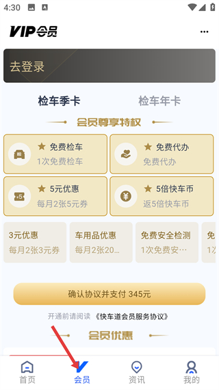 2、會員頁VIP權益含免費檢車、代辦,月發5元3元券,345元開通,以付費體系為車主提供用車增值服務與消費優惠。