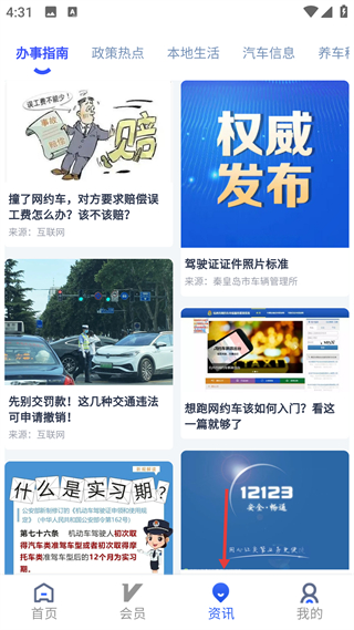 3、資訊頁推汽車實用信息,覆蓋事故理賠、證件標準等指南,含網約車入門、實習期規則,助力車主解用車問題。