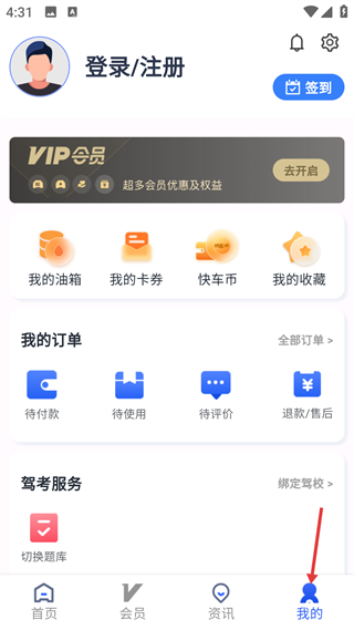 4、我的用戶個人中心,含登錄簽到、VIP入口,可管油箱、卡券、訂單,供駕考題庫切換,集中管賬號與用車記錄。