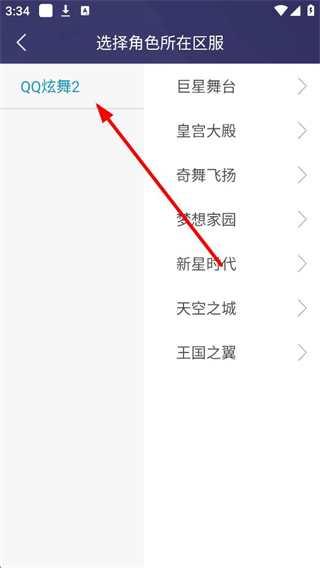 4、進入選擇角色所在區界面,選擇QQ炫舞2游戲,然后選擇具體的服務器如巨星舞臺、皇宮大殿等,完成角色所在區的選擇,推進賬號綁定。