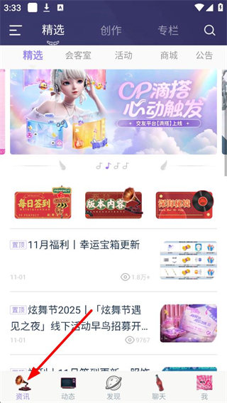1、進入APP精選頁面,可看到CP滴搭心動觸發等活動,還有每日簽到、版本內容等入口,點擊我進入個人中心,準備進行角色綁定操作。