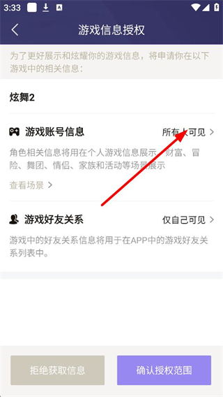 3、游戲信息授權界面,可設置游戲賬號信息為所有人可見,游戲好友關系為僅自己可見,確認授權范圍后可繼續角色綁定流程。