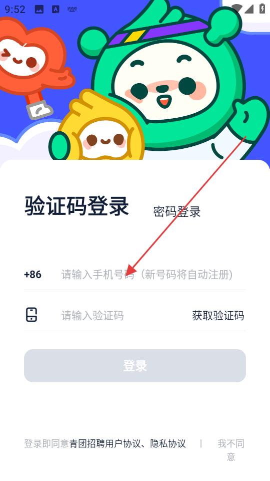 1、打開青團招聘APP,進入驗證碼登錄頁面,在手機號碼輸入框填入號碼,新號碼會自動完成注冊流程,接著點擊獲取驗證碼準備后續登錄。