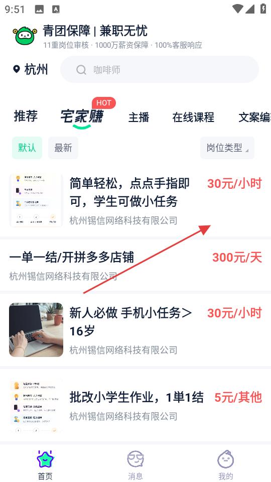2、打開青團兼職APP,在宅家賺頁面瀏覽兼職崗位,找到感興趣的簡單輕松,點點手指即可,學生可做小任務崗位。
