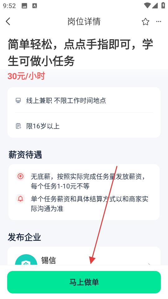 3、在崗位詳情頁,查看薪資待遇、工作要求等信息,確認想做該任務,點擊底部馬上做單按鈕,準備開始任務。