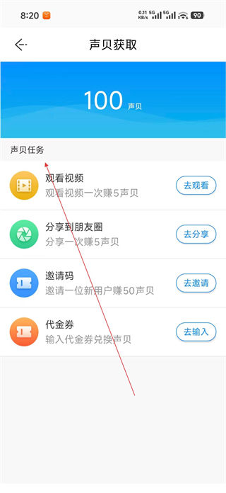 4、根據教程指引進入聲貝獲取頁面,查看聲貝任務列表,可選擇觀看視頻等任務獲取聲貝。