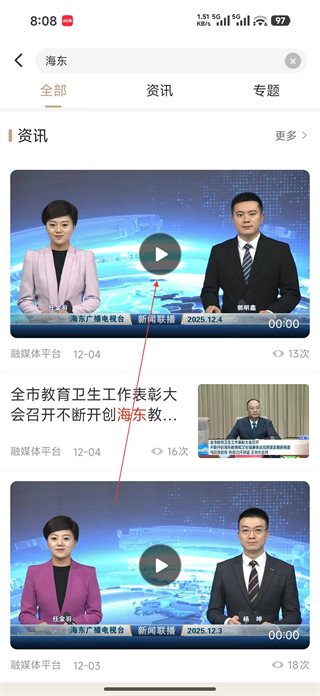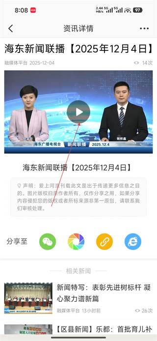 3、在資訊詳情頁找到播放按鈕,點擊啟動新聞視頻播放,可拖動進度條調整播放節點,查看視頻不同時段的內容。