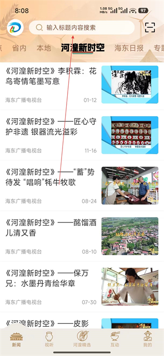 1、打開軟件進入首頁在搜索欄輸入標題內容,點擊搜索按鈕,即可獲取相關資訊結果,也可直接瀏覽頁面展示的河湟新時空系列資訊。
