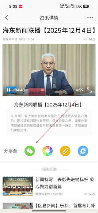 4、分享該資訊在詳情頁底部選擇分享渠道,點擊對應渠道按鈕,完成資訊內容的分享,也可查看相關新聞推薦。
