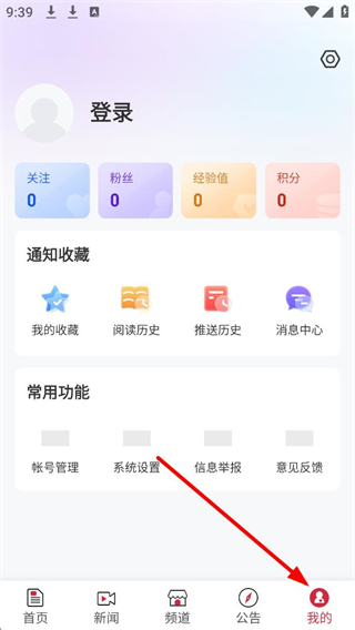 2、我的界面,能看到登錄入口,還有關注、粉絲、經驗值、積分等信息模塊,以及我的收藏、閱讀歷史等功能選項,點擊登錄進入登錄界面。