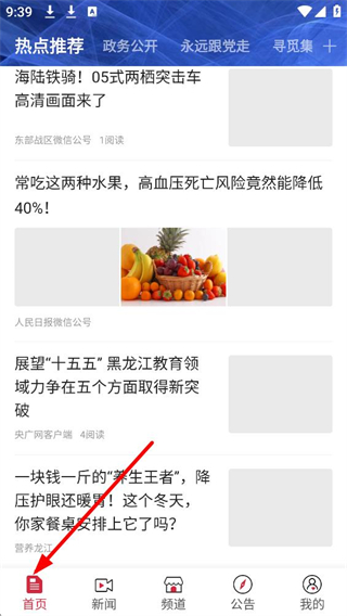 1、打開資訊APP,進入首頁,可看到熱點推薦、政務公開等欄目,展示多條資訊內容,點擊底部我的按鈕進入個人界面。