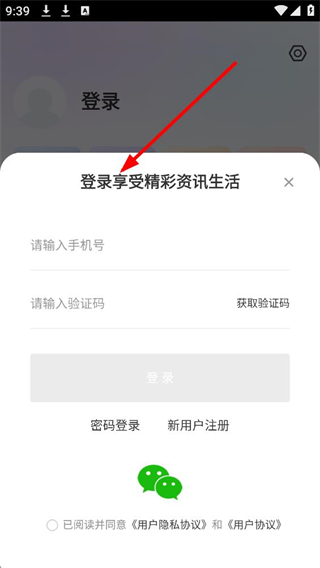 3、進入登錄界面,可輸入手機號、獲取驗證碼后點擊登錄,也可選擇微信登錄方式,登錄前需勾選已閱讀并同意用戶隱私協議和用戶協議。