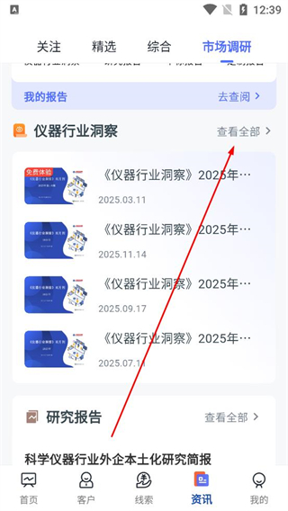 1、打開軟件進入資訊頁面,切換到市場調研板塊,找到儀器行業洞察區域,點擊查看全部按鈕,進入該洞察的列表頁面。
