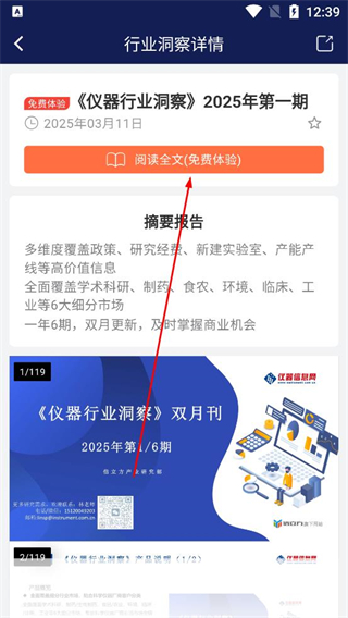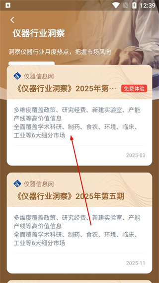 2、在儀器行業洞察列表中選擇2025年第一期,點擊進入該行業洞察的詳情頁面,準備查看報告內容。