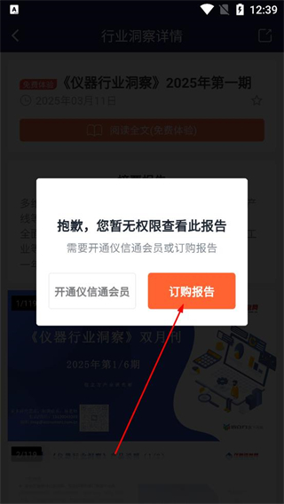 4、在提示彈窗中根據需求選擇開通會員或訂購報告選項,完成后可查看該行業洞察報告的全部內容。
