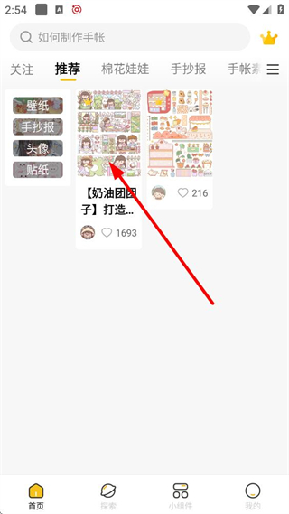 1、進入超萌鴨應用首頁,可在搜索欄輸入手帳相關內容,瀏覽推薦分類板塊,點擊底部我的,進入個人中心頁面。