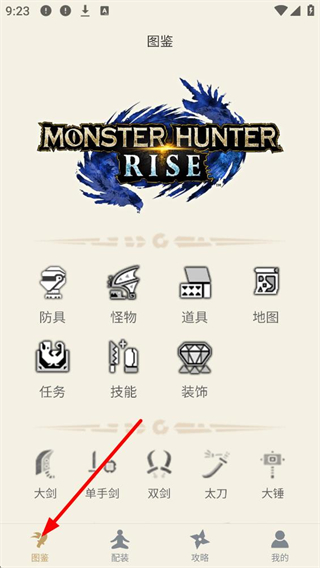 1、進入圖鑒界面,可查看防具、怪物、道具、地圖、任務、技能、裝飾以及大劍、單手劍等各類武器信息,助力了解游戲內各類資源與裝備。
