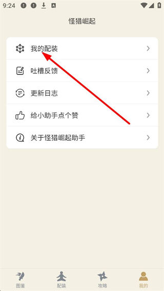 4、我的界面,可查看我的配裝,還能進行吐槽反饋、查看更新日志、給小助手點贊以及了解關于怪獵崛起助手的信息,管理個人游戲相關設置與反饋。