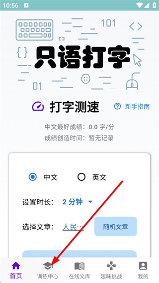 1、進入只語打字首頁,可見打字測速功能,可選擇中英文模式、設置練習時長,點擊底部訓練中心,進入訓練相關頁面。