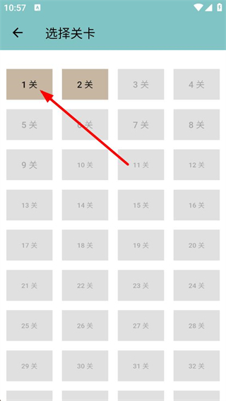 3、進入成語的選擇關卡頁面,展示了多個關卡選項,選擇1關,即可進入對應的成語打字練習關卡。