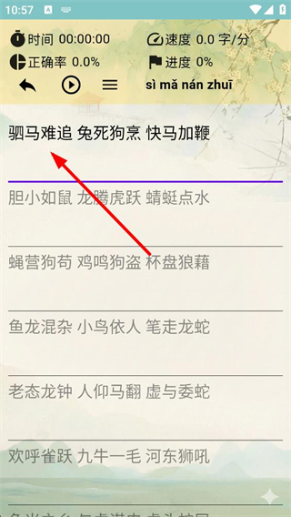 4、進入成語練習界面,能看到多個成語內容,同時顯示時間、速度、正確率等數據,開始進行成語內容的打字練習。