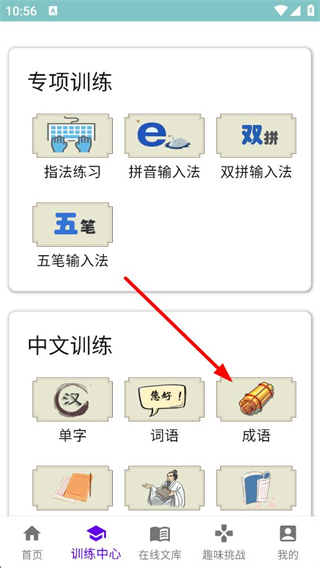 2、進入訓練中心頁面,中文訓練分類下有單字、詞語、成語等選項,點擊成語選項,進入關卡選擇的操作界面。