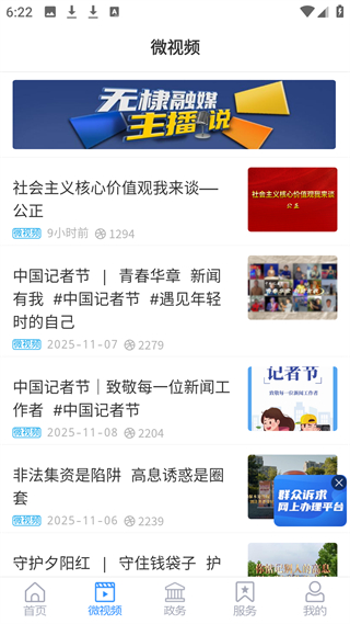 2、微視頻板塊有主播說內容,展示核心價值觀、記者節、非法集資防范等微視頻,呈現價值引導公益宣傳。