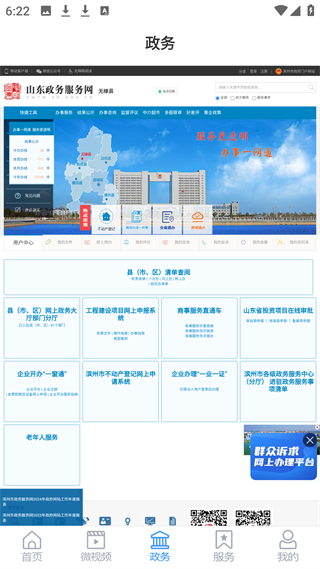 3、政務板塊接入山東政務服務網,有不動產登記、工程申報、商事服務等功能,提供政務辦理查詢服務。