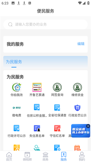 4、服務板塊是便民服務,有你拍我改、藝票通等為民服務,還有繳電費、公積金社保查詢等生活服務。