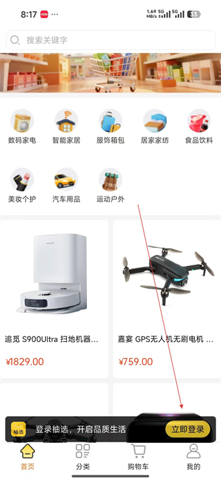 1、打開柚選app,進入首頁后瀏覽各類商品分類,找到立即登錄按鈕,點擊該按鈕進入驗證碼注冊登錄頁面。
