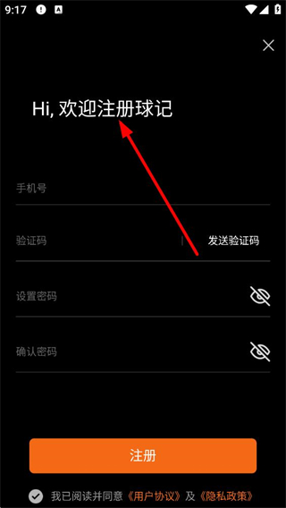 2、球記注冊頁面,輸入手機號、獲取并輸入驗證碼、設置并確認密碼,勾選協議后點擊注冊即可完成新用戶注冊。