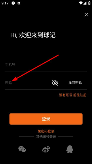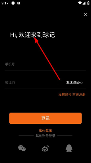 1、進入球記登錄頁面,可輸入手機號、獲取并輸入驗證碼,點擊登錄,也可選擇密碼登錄或其他賬號如微信、微博、QQ登錄,沒有賬號可前往注冊。