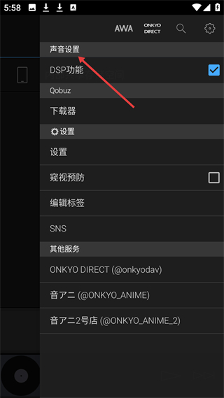 1、音樂APP設置頁,有聲音設置、DSP功能等選項,還有全功能開放、自動同步等設置,可調整音頻和應用功能。