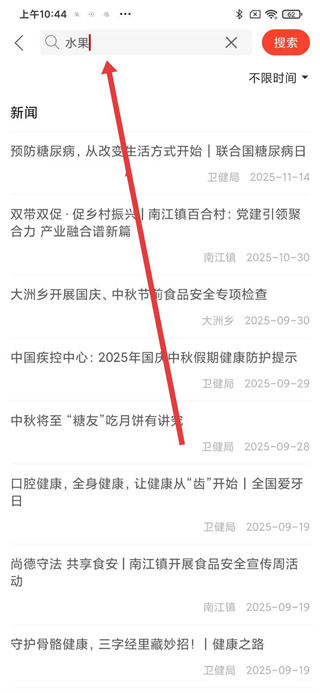 2、進入搜索頁面在搜索框輸入關鍵詞如水果,點擊搜索按鈕,查看相關資訊列表,選擇感興趣的內容點擊進入詳情頁面。