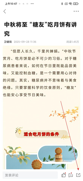 3、在資訊詳情頁閱讀文章內容了解相關知識,比如糖友吃月餅的講究,還能在頁面下方發表評論,與其他用戶交流想法。