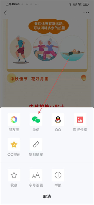 4、點擊詳情頁的分享按鈕,選擇朋友圈微信等分享渠道,還能收藏或調整字號。