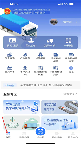 1、首頁有我的證照、我的辦件等功能入口,涵蓋信息查詢、行業服務等板塊,還有12328熱線等服務專區,提供道路運政事項辦理服務。