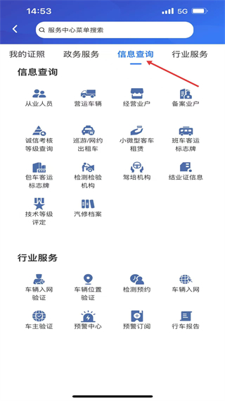 2、信息查詢,可查從業人員、營運車輛等信息,還有誠信考核等級、駕培機構等入口,滿足道路運輸行業信息查詢需求。